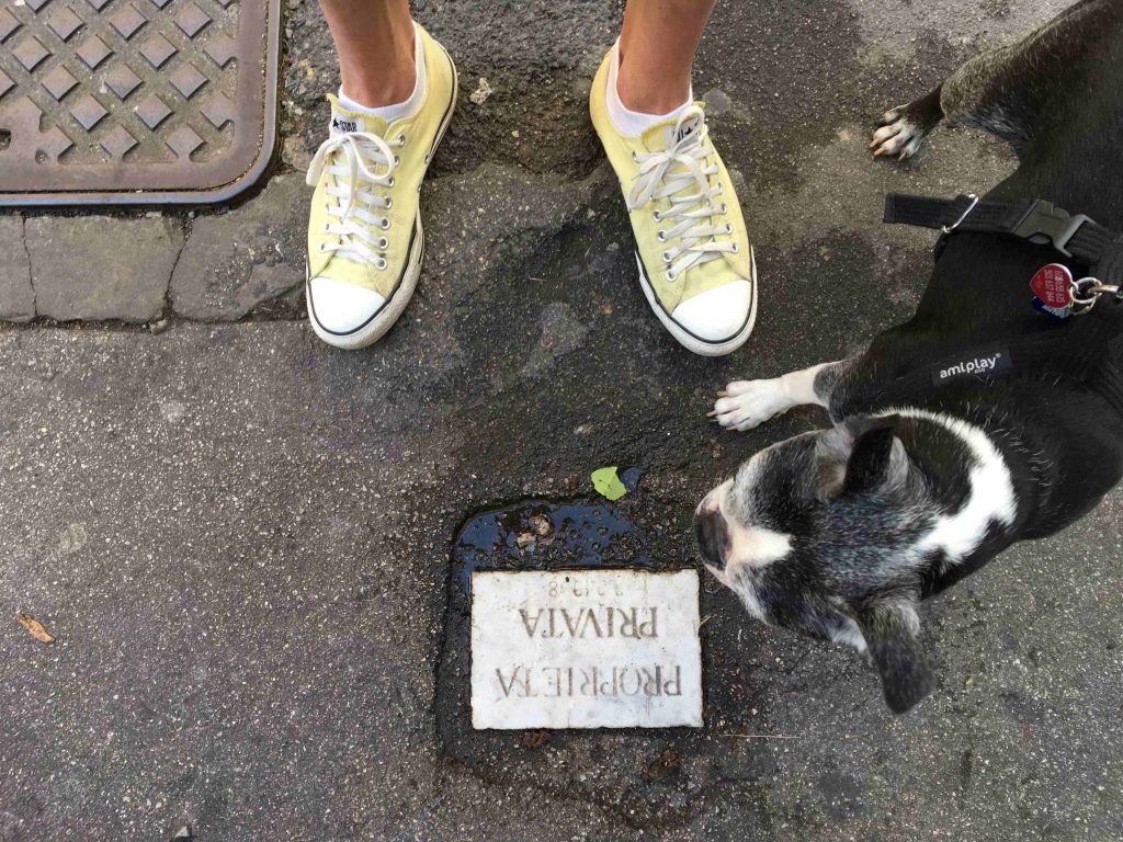 Przed każdym budynkiem, w chodniku, są tabliczki marmurowe.